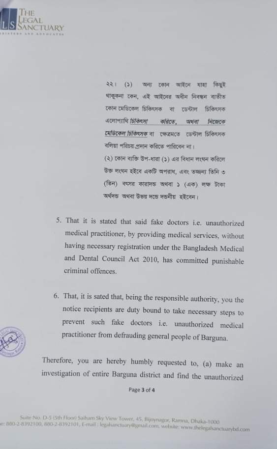 এনে মহসিনা ইয়াসমিন সুমা নামের এক নারীর পক্ষে আইনগত নোটিশ পাঠান। নোটিশে আগামী ১৫ দিনের মধ্যে সমগ্র বরগুনা জেলায় তদন্ত করে অনিবন্ধিত চিকিৎসকদের খুঁজে বের করা, তাদের তালিকা তৈরি করে সিভিল সার্জন অফিসের নোটিশ বোর্ডে টানিয়ে দেয়া এবং তাদের বিরুদ্ধে ফৌজদারী মামলা দায়ের করে আদালতে সোপর্দ করা এই তিনটি বিষয়ে পদক্ষেপ নিতে অনুরোধ করা হয়। এ বিষয়ে নাগরিক অধিকারের পক্ষে লিগ্যাল নোটিশ প্রেরক বাংলাদেশ সুপ্রীম আইনজীবী হাসান তারিক (পলাশ) বলেন, স্বাস্থ্যসেবার অধিকার আমাদের অন্যতম সাংবিধানিক মৌলিক অধিকার। এদের কারনে নাগরিকরা যেমন ক্ষতিগ্রস্ত হয়, তেমনি অপচিকিৎসার শিকার হয়ে প্রানহানির মত ঘটনা ঘটছে। আমাদের দাবি, সকল অনিবন্ধিত চিকিসকদের চিকিৎসার নামে ব্যবসা বন্ধ করতে সরকারের যথাযথ কর্তৃপক্ষ আইনগত ব্যবস্থা গ্রহন করবে। এ বিষয়ে বরগুনার সিভিল সার্জন ডা. মারিয়া হাসান বলেন, সম্প্রতি শিশুর মৃত্যুর ঘটনার পর আমরা ভুয়া চিকিৎসকদের তালিকা তৈরি করে জেলা প্রশাসনের কাছে পাঠানোর ব্যবস্থা নিচ্ছি। এছাড়াও আমরা এদের ব্যাপারে বিধিমোতাবেক যথাযথ ব্যবস্থা গ্রহন করব। জেলা প্রশাসক হাবিবুর রহমান বলেন, ভুয়া চিকিৎসকদের ব্যাপারে আমরা নিয়মিত অভিযান পরিচালনা করে আসছি। স্বাস্থ্য বিভাগের সহায়তায়, তাদের সাথে নিয়ে আমরা দ্রত ভুয়া চিকিৎসক সনাক্ত ও তাদের বিরুদ্ধে আইনগত ব্যবস্থা গ্রহন করব।